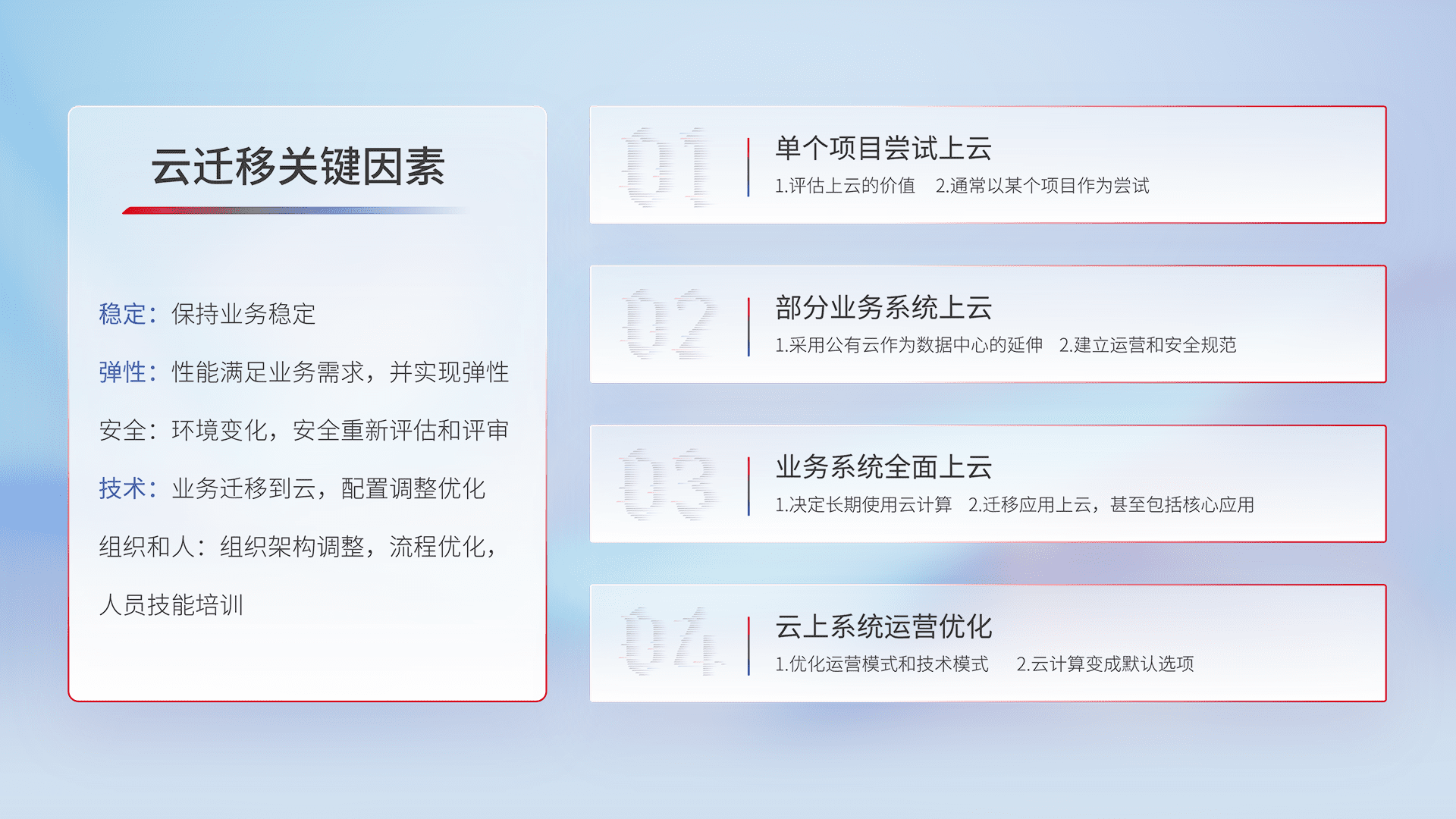 结合实际业务,,,从规划设计、、云平台选型、、云原生改造、、数据迁移、、、、集成交付,,迁移全过程为客户识别最佳上云路径,,,做好风险识别管理,,,,设计网络架构、、、、身份权限、、、安全审计合规、、操作审计、、、日志审计、、、、监控告警策略、、多站点容灾设计等,,,对云上基础设施进行整体规划,,,,提升IT治理水平,,以满足弹性、、、、高可用、、、高性能的需求。。。。