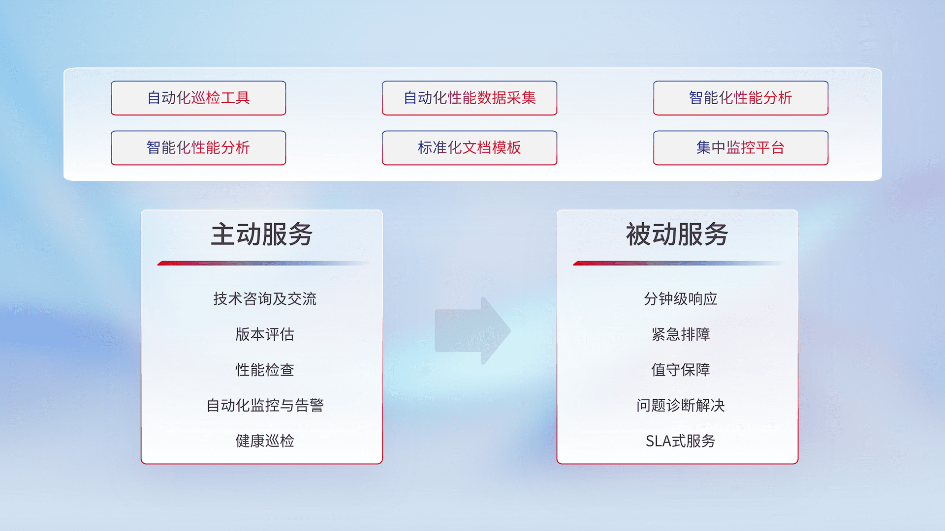 智能化工具和标准化文档,,,保障服务质量,,,提供主动服务(包含技术咨询、、、版本评估、、、、性能检查、、、、自动化监控与告警、、健康巡检)和被动服务包含(分钟级响应、、、、紧急排障、、、值守保障、、、问题诊断解决、、、、SLA服务)。。