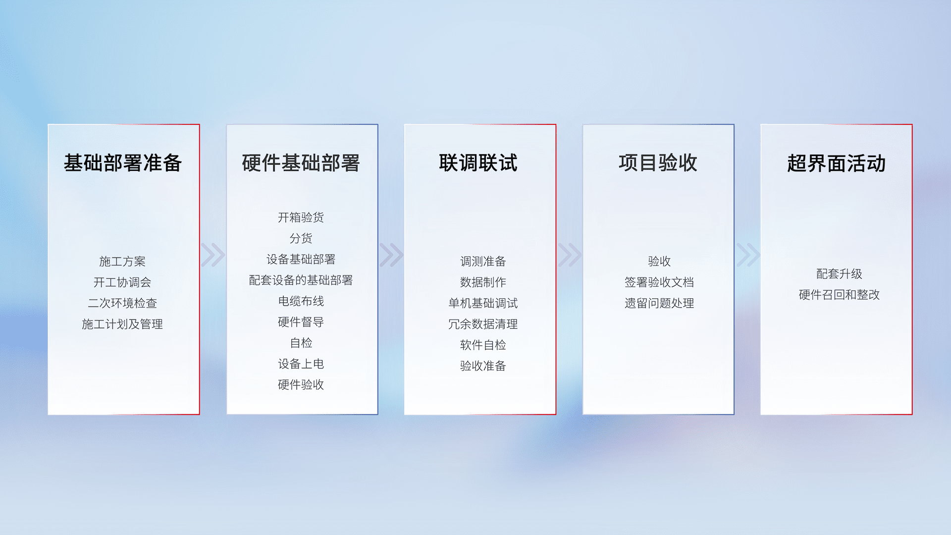 从基础部署准备、、、硬件基础部署、、联调联试、、、项目验收、、、、越界面活动的全过程可追溯,,,,保证施工质量和进度。。。。
